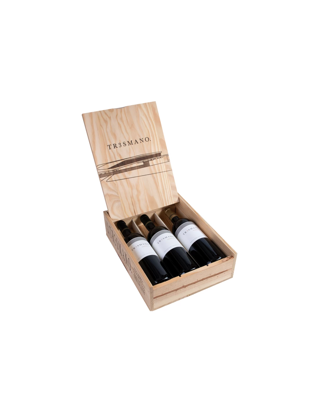 Magnífico estuche de 3 botellas de vino Tresmano de las añadas 2018, 2019 y 2020. Un estuche de madera muy exclusivo y de edición limitada ideal para coleccionistas. Una vertical de las 3 últimas añadas de la bodega para poder ver la evolución de sus vinos.