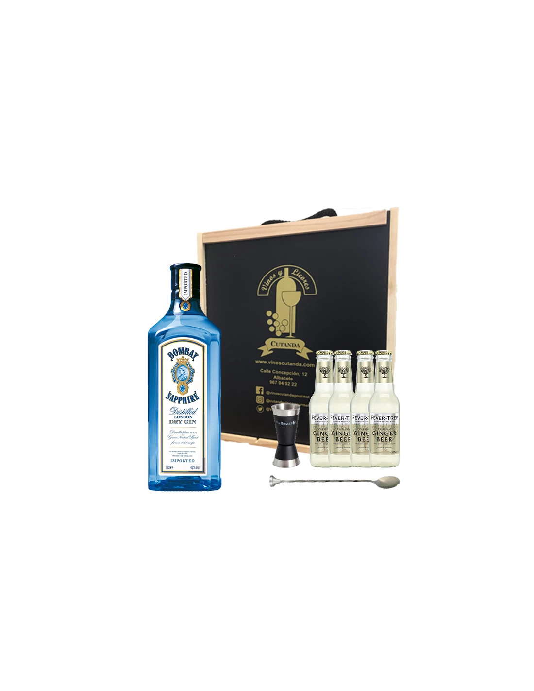 Este pack de ginebra incluye 1 botella de ginebra Bombay Sapphire, 4 tónicas Fever Tree, 1 Jigger de varias medidas y 1 Cuchara Trenzada de Cocktel. Todo ello en una caja de madera. Es ideal como regalo de todo tipo.